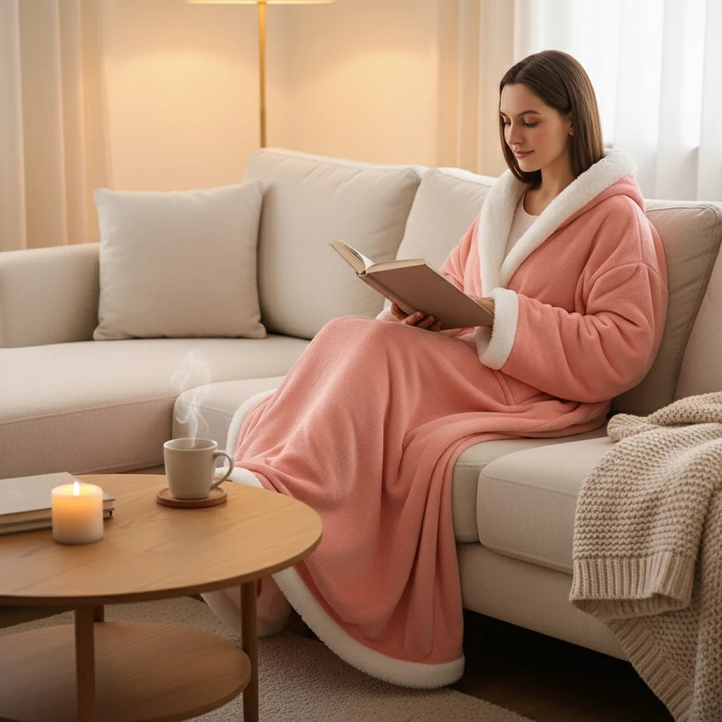 Unwrap your Heated Cuddle Blanket. Feel the plush softness. Slip your arms into the cozy sleeves and pull up the hood for instant, head-to-toe warmth. Your personal comfort journey begins now, melting away the day's stress.